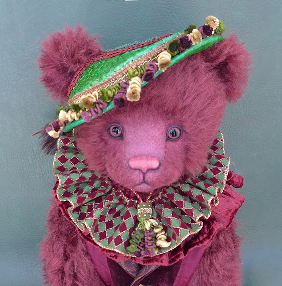 Wessex is 24" tall and made from a dense distressed burgundy mohair. I trimmed his muzzle short so I could add paler coloration for depth. He has special mauve glass eyes with striated irises and elaborate eyelids. His matching leather paw pads have sculpted pulled toes with shading. Accessorized like a medieval character, I crafted him a matching cap complete with lush coordinating trims and feathers and he has a harlequin style ruff with a velvet ruff below complete with tassels and a vest. He has rare earth magnets in his paws to hold his court jester wand or to clasp his hands together. He comes with a tush tag and a Certificate of Authenticity. Layaway available, please see bottom of page for details.